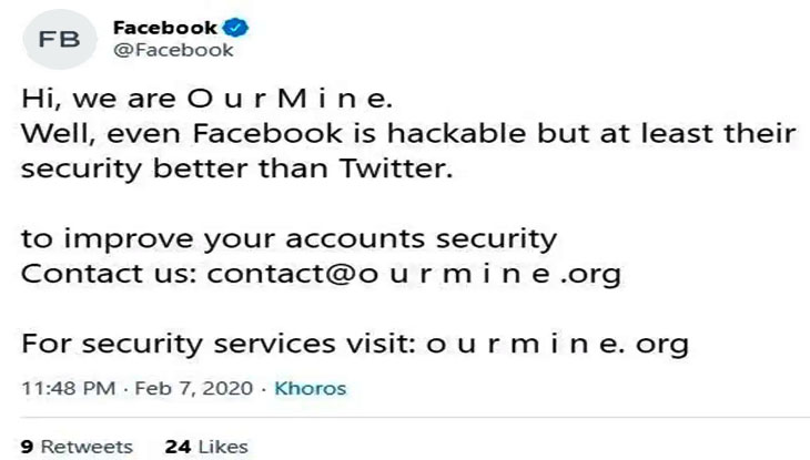 দুবাইভিত্তিক হ্যাকিং গ্রুপ ‘আওয়ার মাইন’ ফেসবুকের টুইটার অ্যাকাউন্ট হ্যাক করেছে।